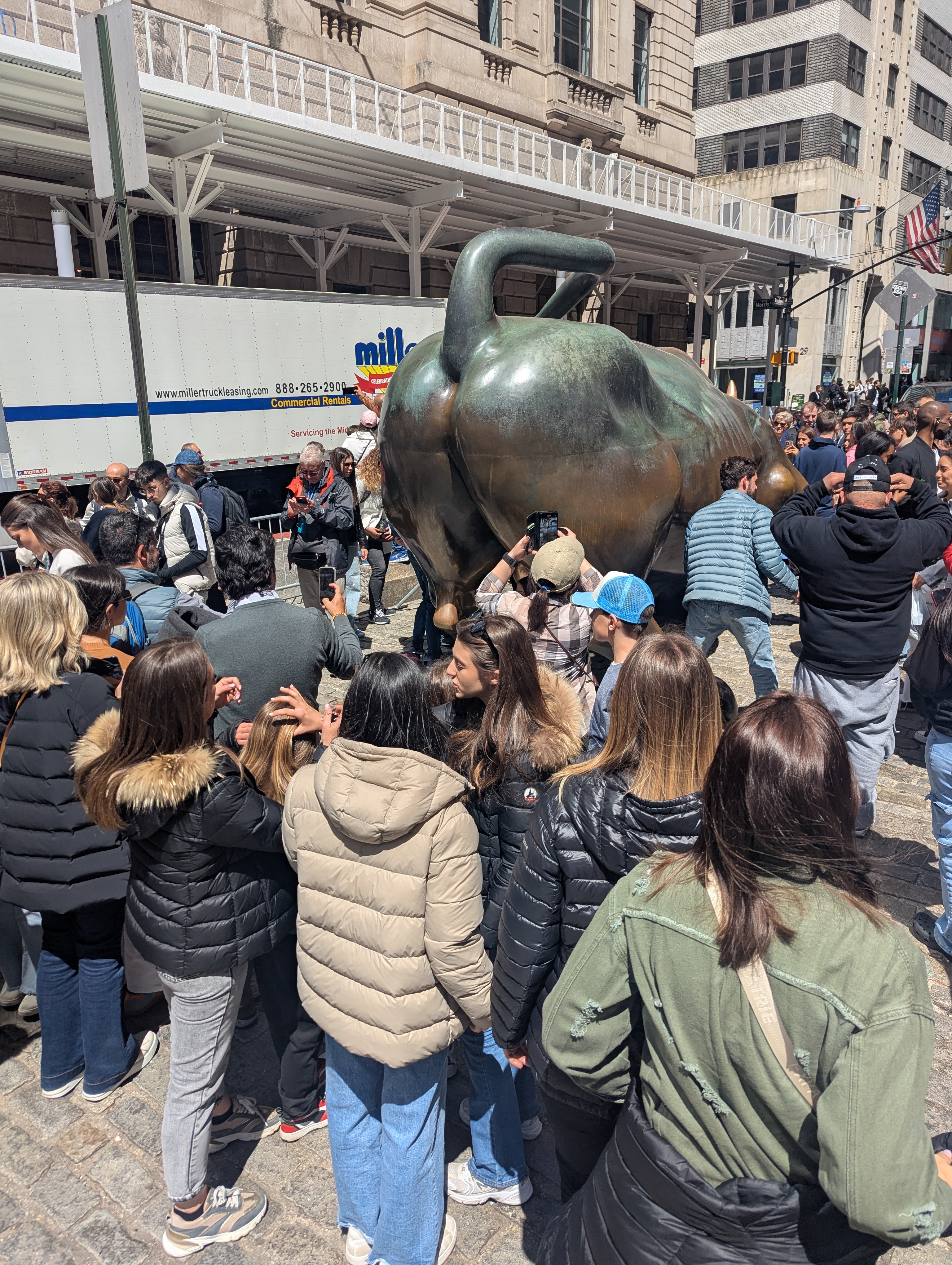At Wall Street there is a very popular statue of a Bull that represent part of the stock market and it's really popular with tourists. The line to ssee the bull was super long.